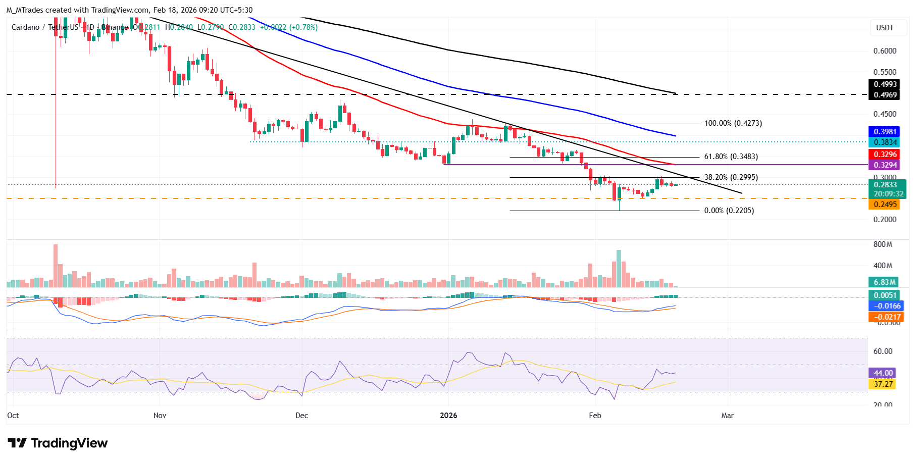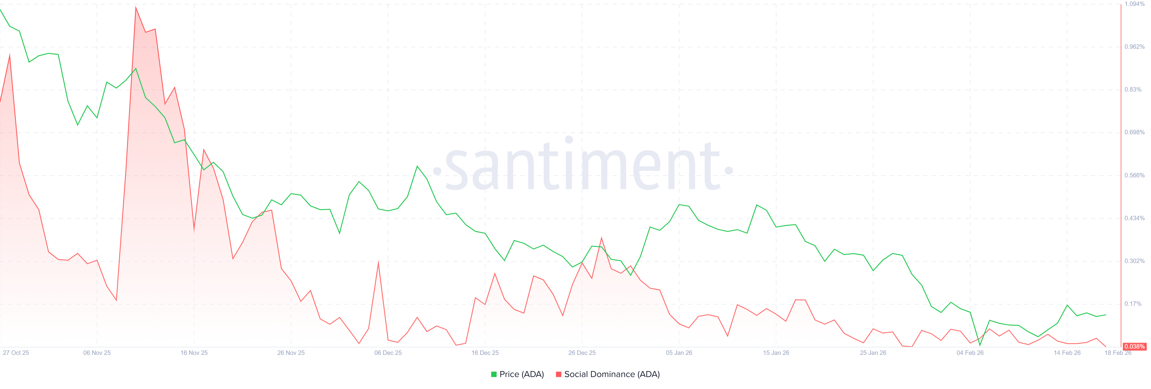 Santiment’s Social Dominance metric for Cardano supports a bearish outlook. The index measures the share of ADA-related discussions across the cryptocurrency media. It has been in a downward trend since the end of December, falling again in early February to 0.038% on Wednesday. This fall indicates fading market interest and weakening sentiment among ADA investors. This combination of accumulation alongside weakening sentiment suggests indecision among investors and limits the chances of a sustained recovery.