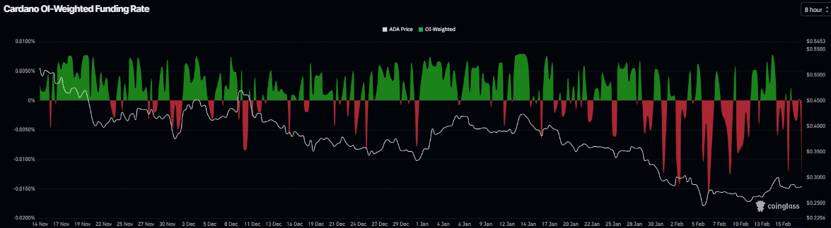 In addition, Coinglass’s OI-Weighted Funding Rate data shows that the number of traders betting that the price of Cardano will slide further is higher than those anticipating a price increase. The metric turned negative on Wednesday and stands at -0.0130%, nearing the February 6 levels, when ADA dropped sharply. The negative ratio suggests that shorts are paying longs, suggesting bearish sentiment toward ADA.