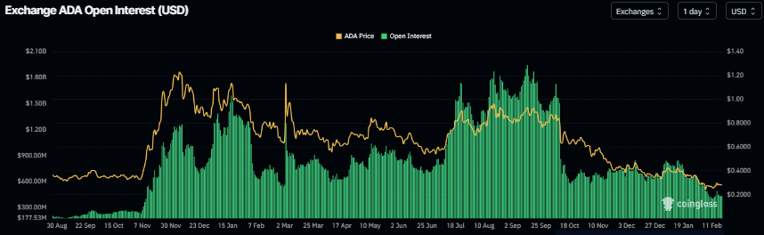 Cardano futures Open Interest (OI) falls to $436 million on Wednesday, having been steadily declining since mid-January and nearing the February 12 level of $407 million. This drop in OI reflects waning investor participation and projects a bearish outlook.