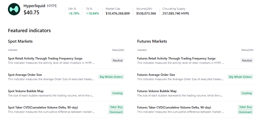 CryptoQuant’s summary data supports the positive outlook, as HYPE’s spot and futures markets show large whale orders, cooling conditions, and buy dominance, all of which signal a potential upside move.