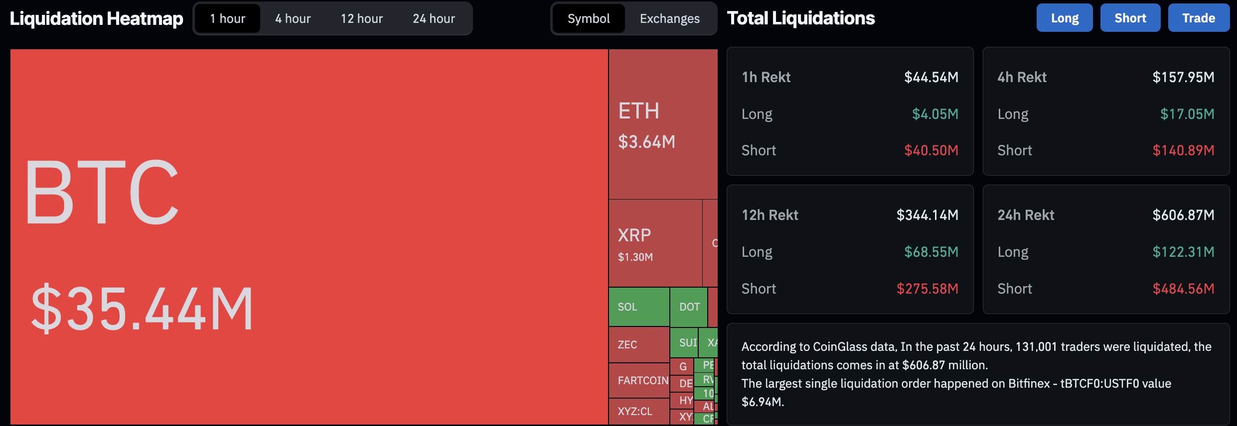 The rebound in the cryptocurrency market has liquidated 131,000 traders, totaling $606 million in liquidations over the last 24 hours, led by $484 million in short liquidations.