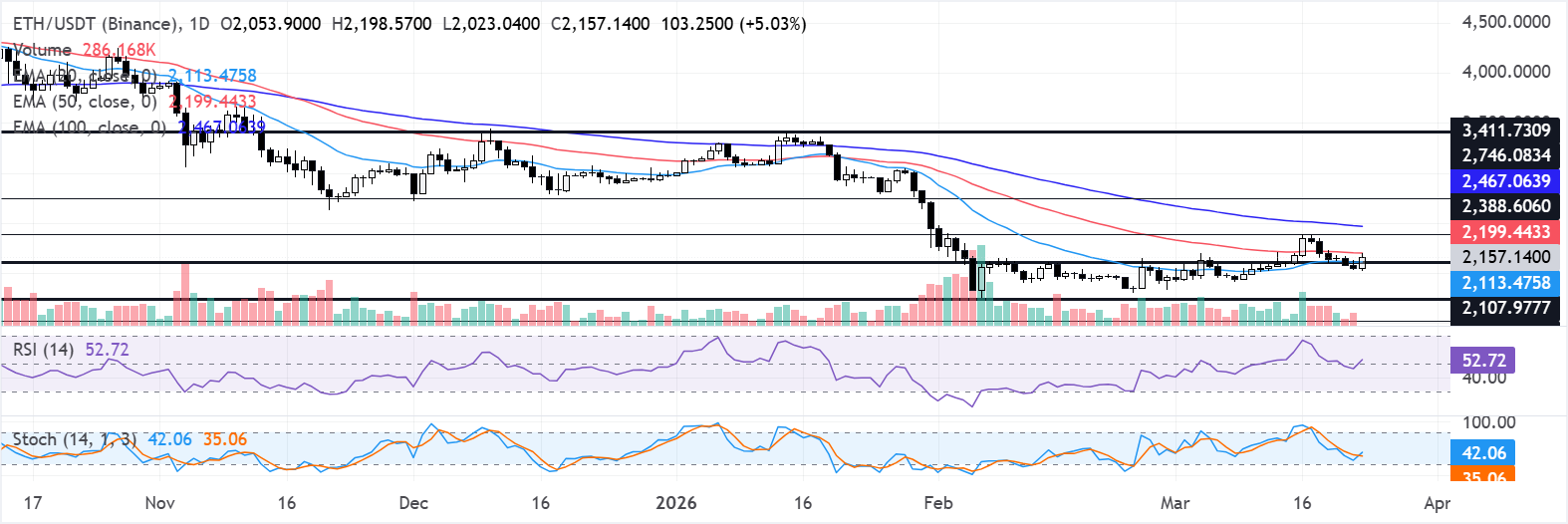 Immediate resistance lies at the 50-day EMA, then at $2,388, where a break would open the way to the next upside barrier at $2,746. On the downside, initial support aligns around the 20-day EMA and nearby horizontal level at $2,108, with a daily close below exposing the deeper support band at $1,741, followed by $1,524.