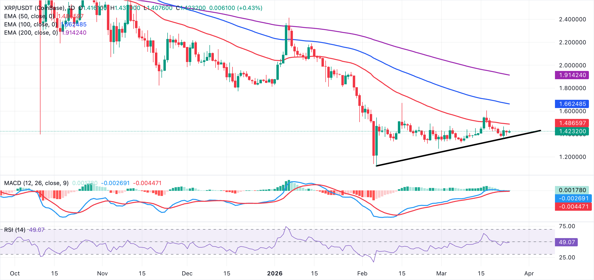 Still, the price holds well below the 50-day, 100-day and 200-day Exponential Moving Averages (EMAs), keeping the broader structure under downside pressure despite the medium-term uptrend line origin near $1.12.