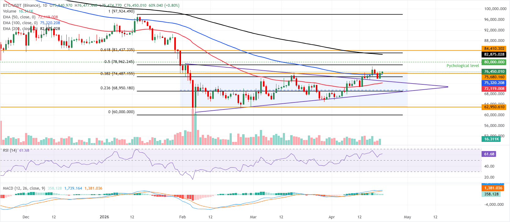 Bitcoin is trading above $76,000 on Tuesday, after rallying nearly 3% from the previous day. BTC is maintaining a constructive bullish bias as it holds above the 50-day and 100-day Exponential Moving Averages (EMAs) at $72,119 and $75,320, respectively, and trades above the upper band of the horizontal channel at $75,680.
