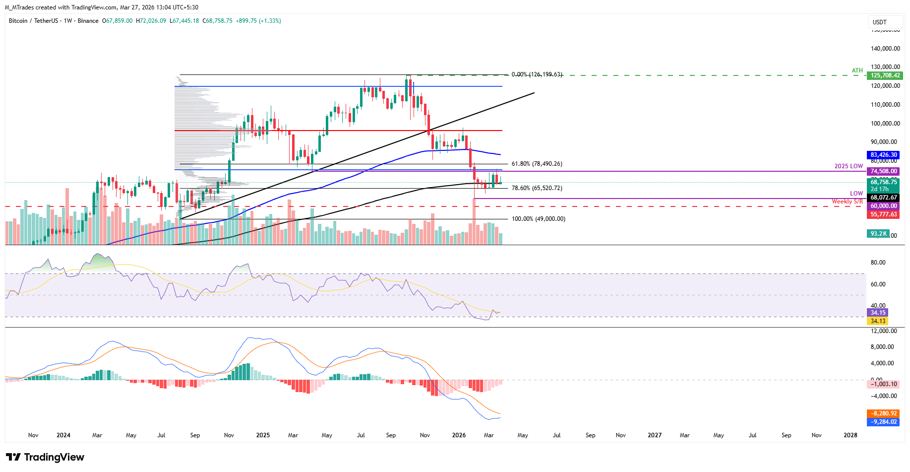 If the 200-week EMA at $60,072 fails to hold as support, Bitcoin could extend the correction toward the 78.60% Fibonacci retracement level at $65,520 (drawn from the August 2024 low of $49,000 to the October 2025 all-time high of $126,199).