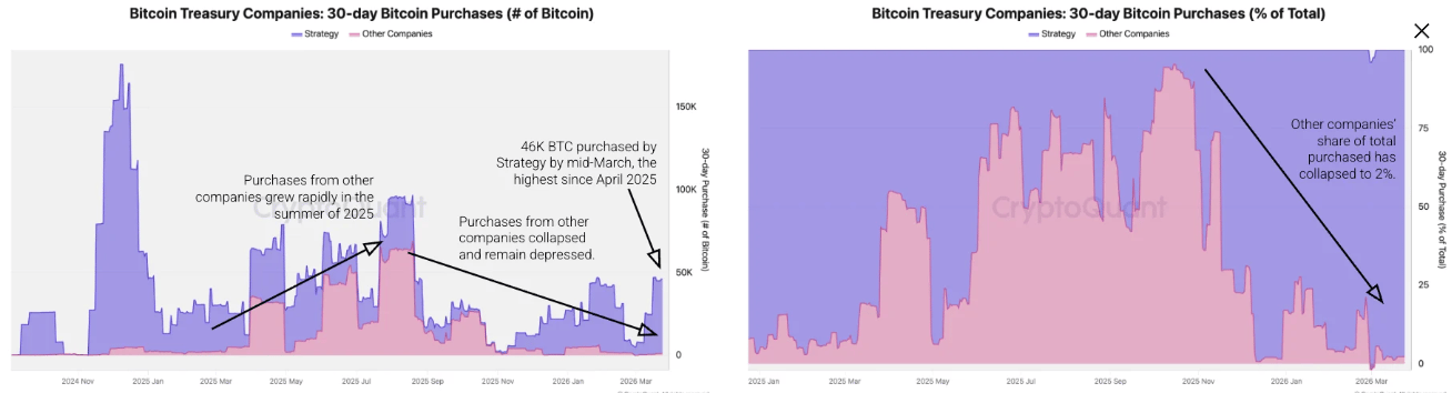 The report explained that MSTR has accumulated more than 45,000 BTC in the last 30 days, the highest 30-day purchase since April 2025. On the contrary, BTC purchases from all other treasury companies have collapsed, totaling 1,000 BTC in the last 30 days, a 99% decline from the high of 69,000 BTC in August 2025. Moreover, the share of purchases from these other treasury companies has declined to 2%, from 95% in October last year.