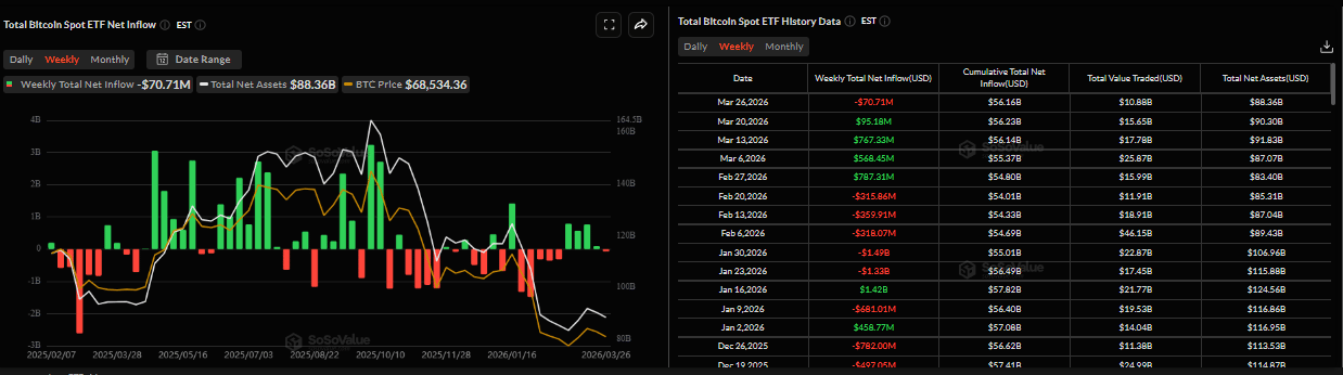 As of Thursday, net flows show a slight bearish trend, with a total net outflow of $70.71 million this week. If these outflows continue on Friday, the week will end on a negative note, breaking the four-week streak of positive flows, which could lead to further correction toward the Crypto King.