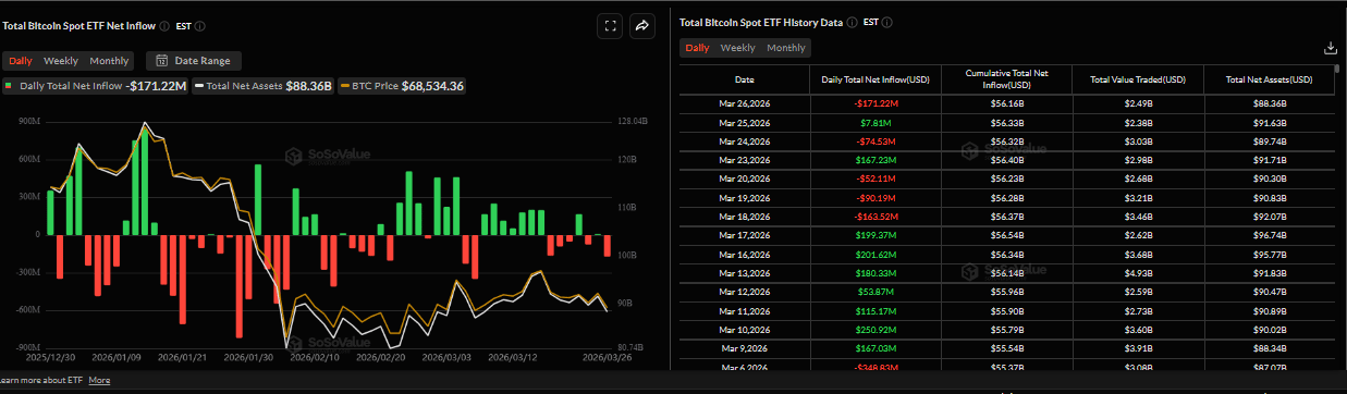 Institutional flows reflect the mixed market sentiment, with a slight bearish bias so far this week. SoSoValue data show that Bitcoin spot Exchange Traded Funds (ETFs) have seen alternating inflows and outflows this week, beginning with positive flows of $167.23 million on Monday, followed by an outflow of $74.53 million on Tuesday, a mild inflow of $7.81 million on Wednesday, and then a $171.22 million negative flow on Thursday.