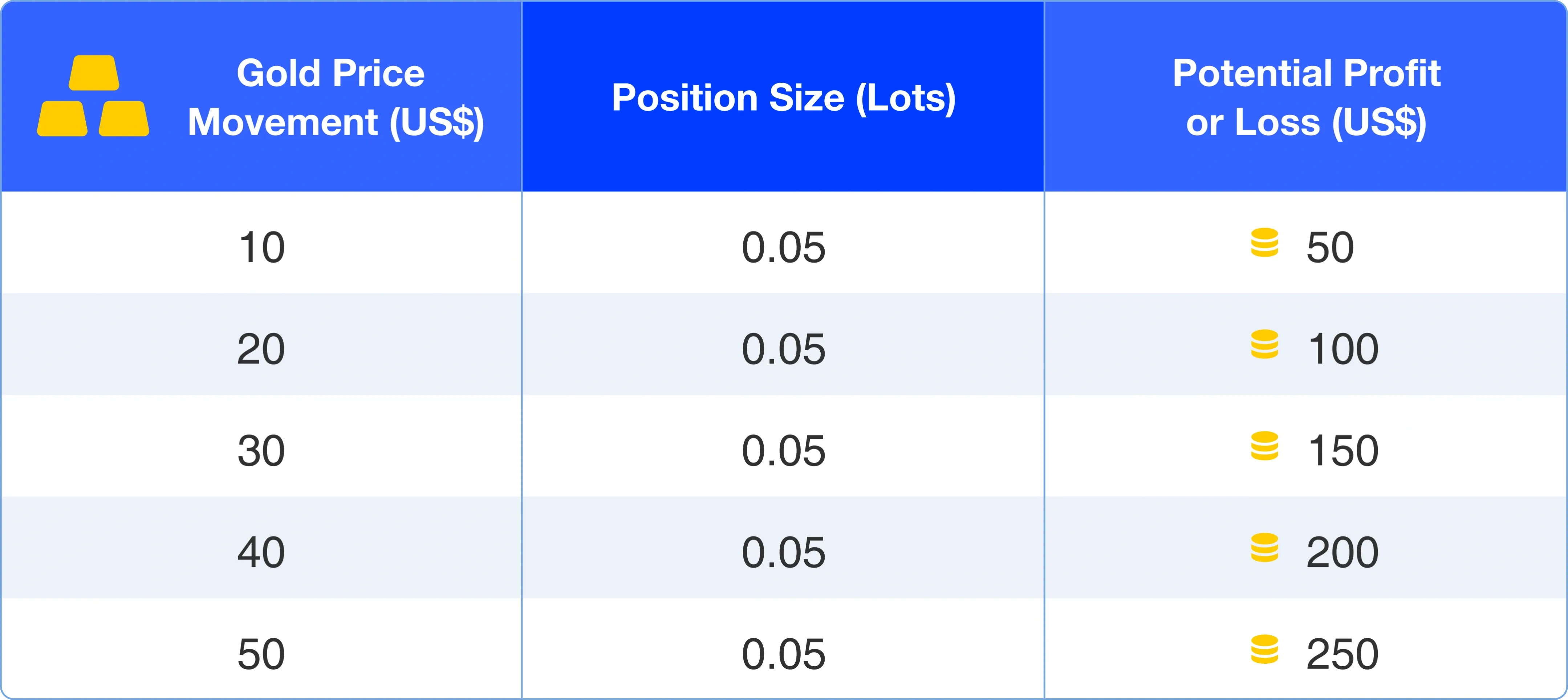 *All figures are for illustrative purposes only. Potential profit or loss is calculated as: P/L=Price Change × Lots × Contract Size. These figures are theoretical estimates and do not account for spreads, slippage, or fees.