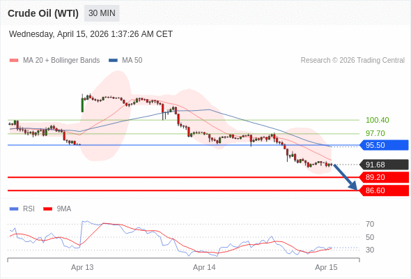 Short positions below 95.50 with targets at 89.20 & 86.60 in extension.