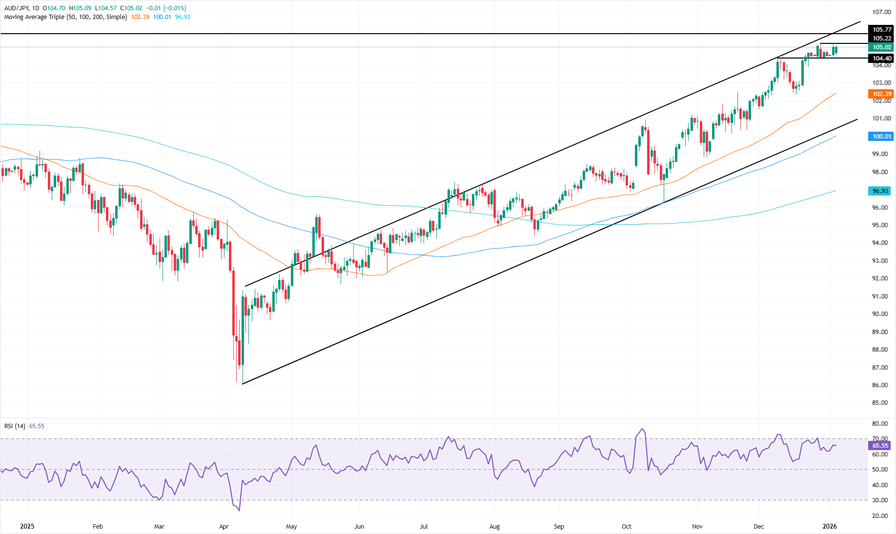 The technical picture reveals that the uptrend in the AUD/JPY remains intact, confirmed by a rising Relative Strength Index (RSI) in convergence with price action. The RSI is at 65.20 with the slope showing signs that bulls are in charge, while the pair remains shy of cracking last year’s peak at 105.22.