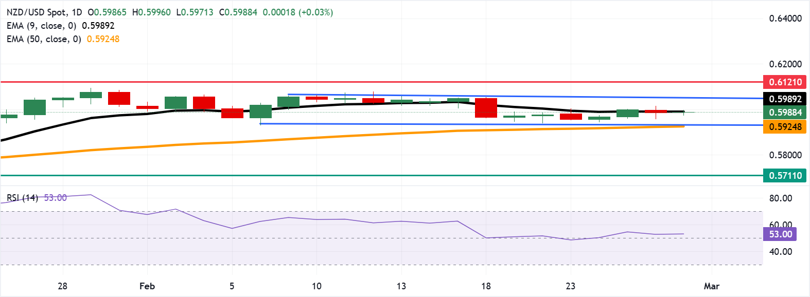The NZD/USD pair holds above its rising 50-day Exponential Moving Average (EMA) while clinging to the flattened nine-day average at 0.5989, keeping a modest bullish bias intact but with fading momentum.
