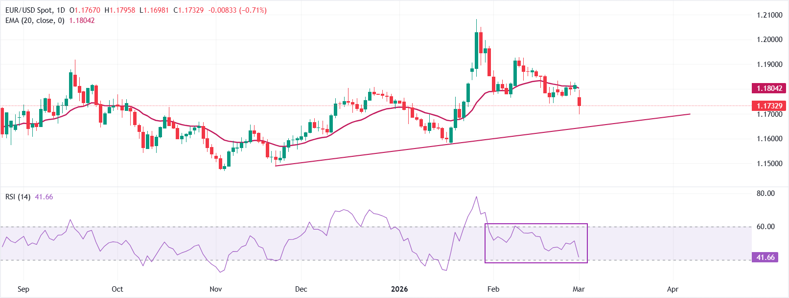 EUR/USD trades 0.75% lower at around 1.1730 at the press time. The near-term bias turns mildly bearish as spot slips below the 20-day Exponential Moving Average near 1.1800.