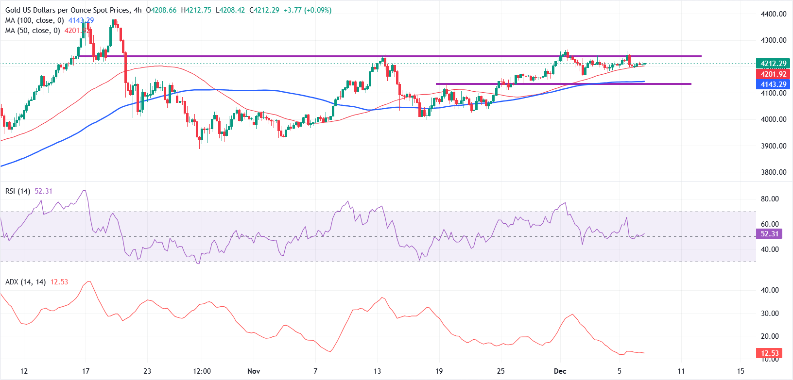 Gold (XAU/USD) remains range-bound, with repeated dip-buying interest emerging in the $4,200-$4,180 zone. On the 4-hour chart, the 50-period SMA is acting as immediate dynamic support near $4,201, while the 100-period SMA around $4,142 provides a deeper cushion.