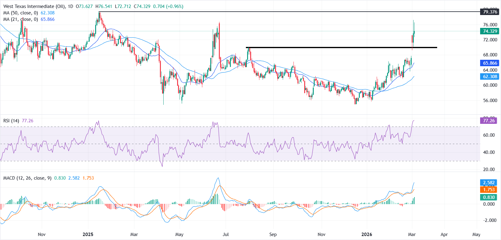 West Texas Intermediate (WTI) Crude Oil trims part of its intraday gains on Wednesday as traders assess geopolitical developments surrounding the US-Iran conflict. At the time of writing, WTI trades near $74.32 after briefly reaching a one-year high of $77.20 on Tuesday.