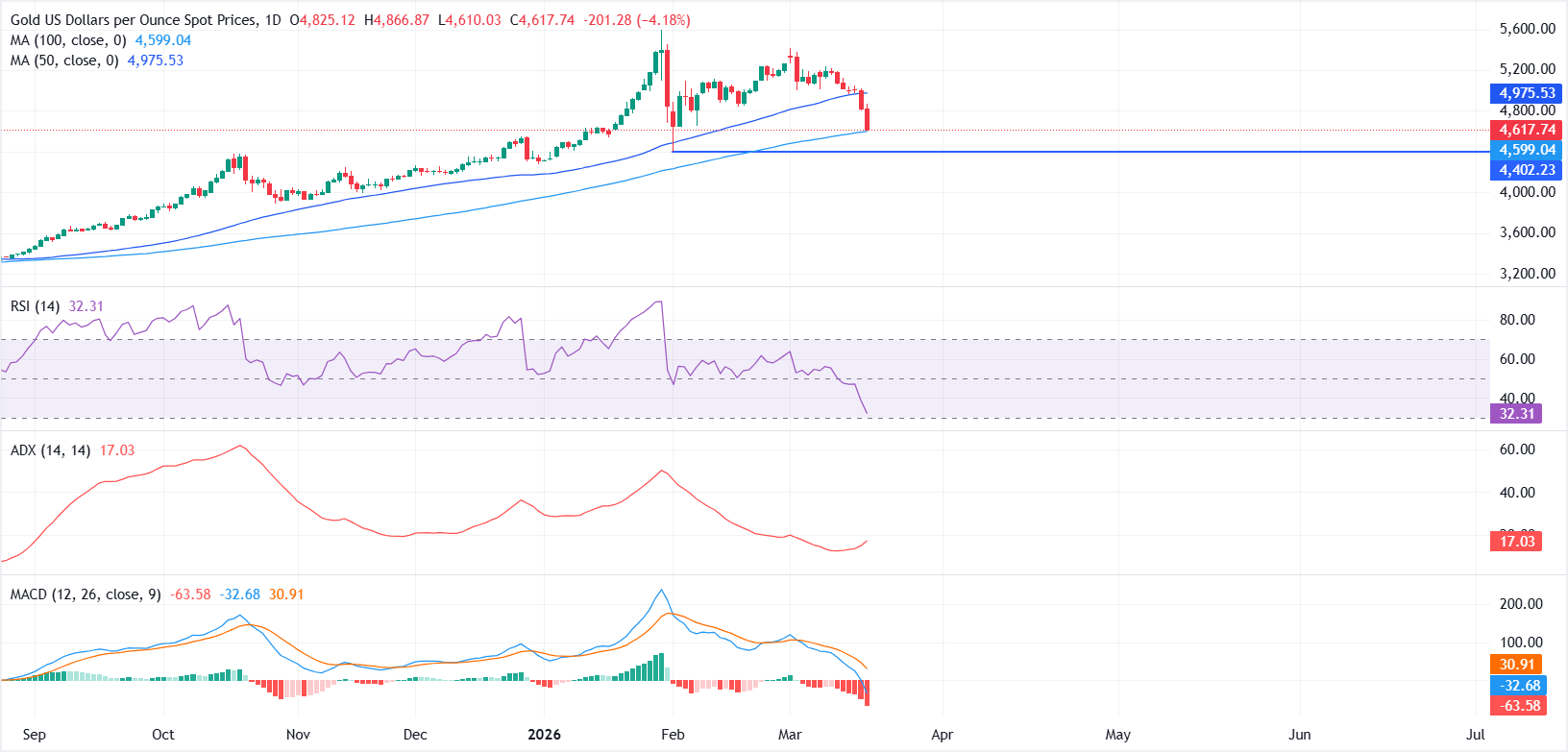 At the time of writing, XAU/USD is trading around $4,617, its lowest level since February 2, remaining on the back foot for a seventh consecutive day.