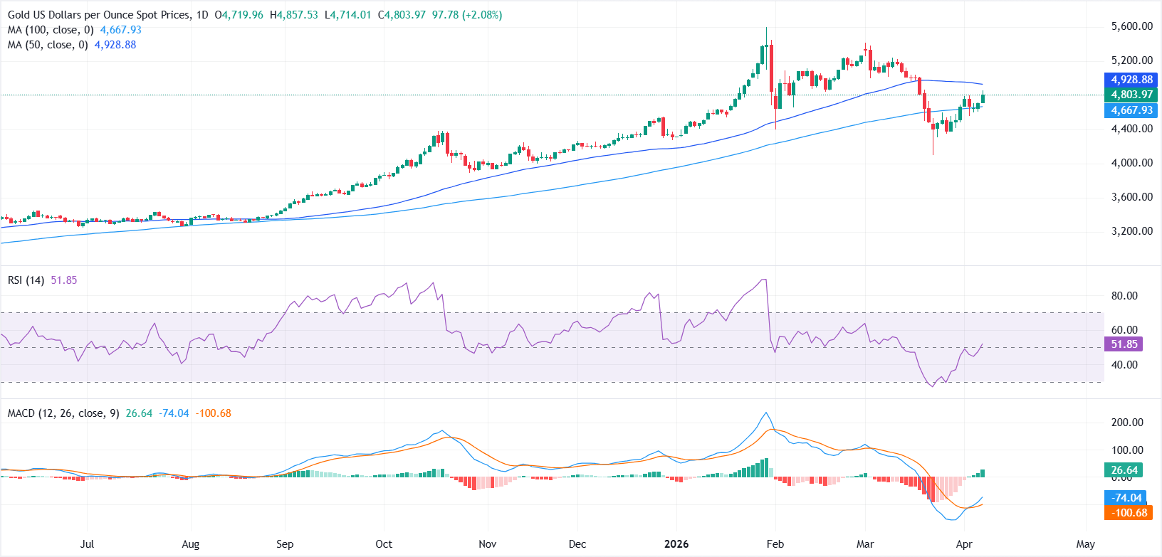 Gold (XAU/USD) climbs toward three-week highs on Wednesday after the United States and Iran reached a temporary two-week ceasefire agreement, offering relief to markets following days of escalating tensions. At the time of writing, XAU/USD is trading around $4,803, up nearly 2% on the day after touching an intraday high of $4,857.