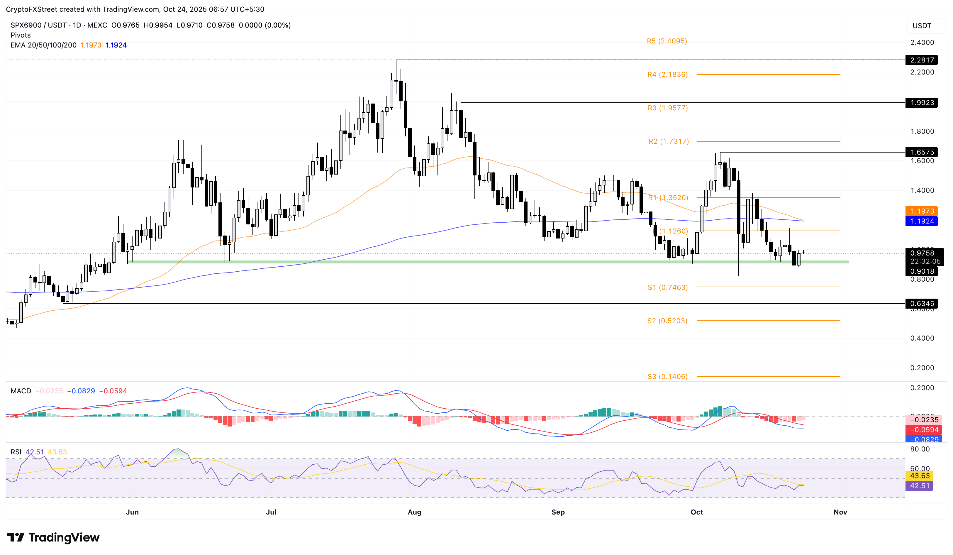 SPX6900 struggles to reclaim the $1 psychological level despite the 9% bounce back on Thursday from the $0.9018 demand zone. At the time of writing, SPX trades above $0.9700, holding to the Thursday gains.