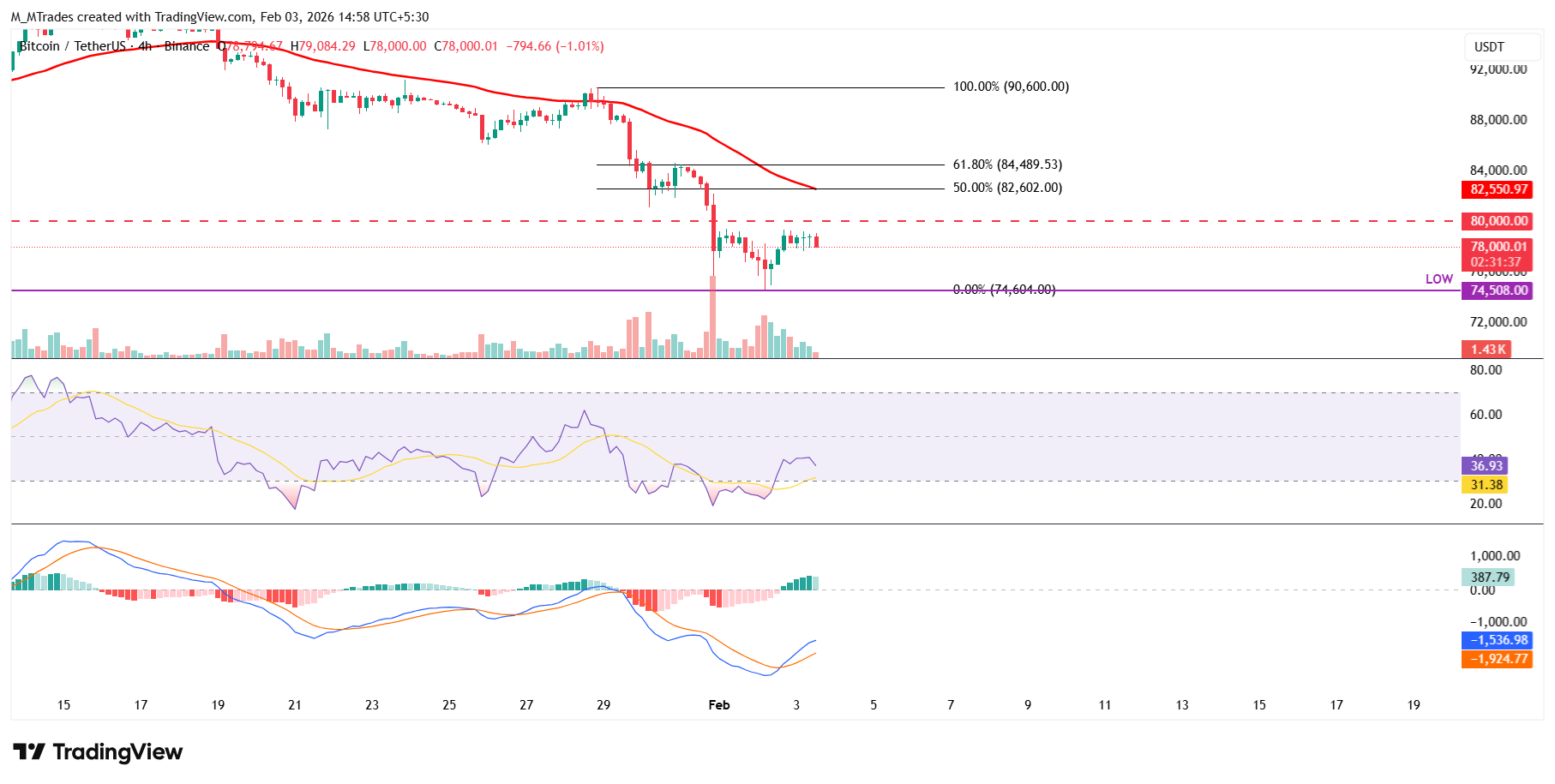 If BTC continues its recovery, it could first advance toward the key psychological level at $80,000. A close above this level could extend recovery toward the 50% Fibonacci retracement level (drawn from January 28 high of $90,600 to Monday’s low of $74,604) at $82,602, which coincides with the 50-period 4-hour Exponential Moving Average (EMA).