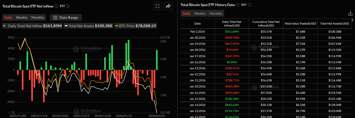 Institutional demand supported a slight recovery in Bitcoin at the start of the week. SoSoValue data shows that spot Bitcoin ETFs record a fresh inflow of $561.89 million on Monday, breaking the streak of outflows since last week. Moreover, Monday’s flow was the highest single-day inflow since mid-January. For the relief rally to be sustained, the ETF inflows must continue and intensify.