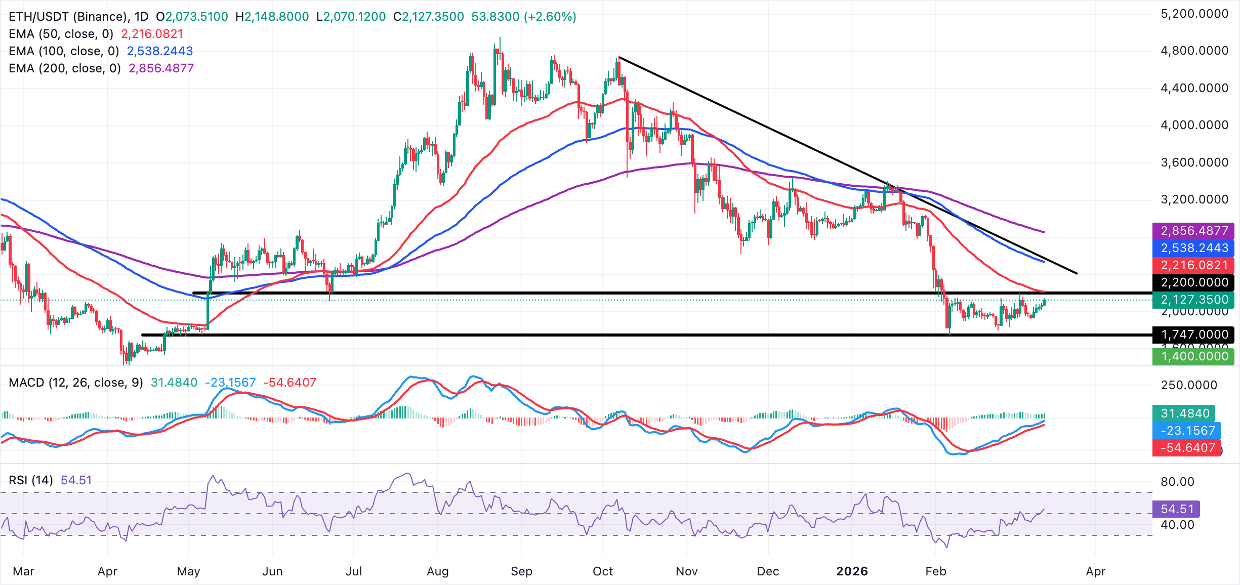 A break above the range resistance around $2,200, which coincides with the 50-day EMA at $2,216, is required to extend gains, aiming for the 100-day EMA at $2,538 and then the 200-day EMA at $2,856.