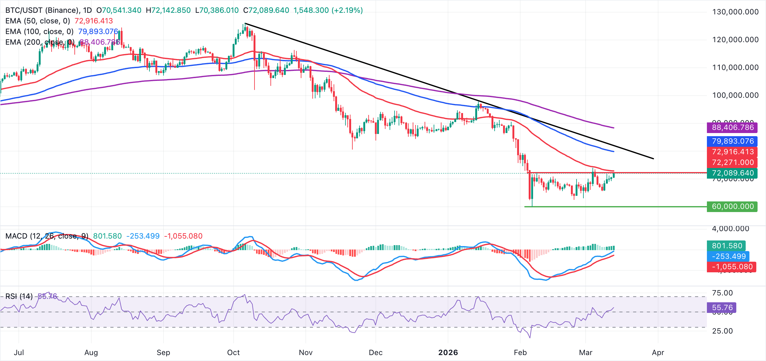 Bitcoin is trading above $72,000 with the near-term bias cautiously bullish after the price pushed through the $70,000 handle. The Crypto King is closing in on the cluster of Exponential Moving Averages (EMAs) that continue to trend well above the current spot. The Moving Average Convergence Divergence (MACD) indicator is above its signal line on the daily chart, with widening green histogram bars, suggesting strengthening upside momentum after the recent consolidation.