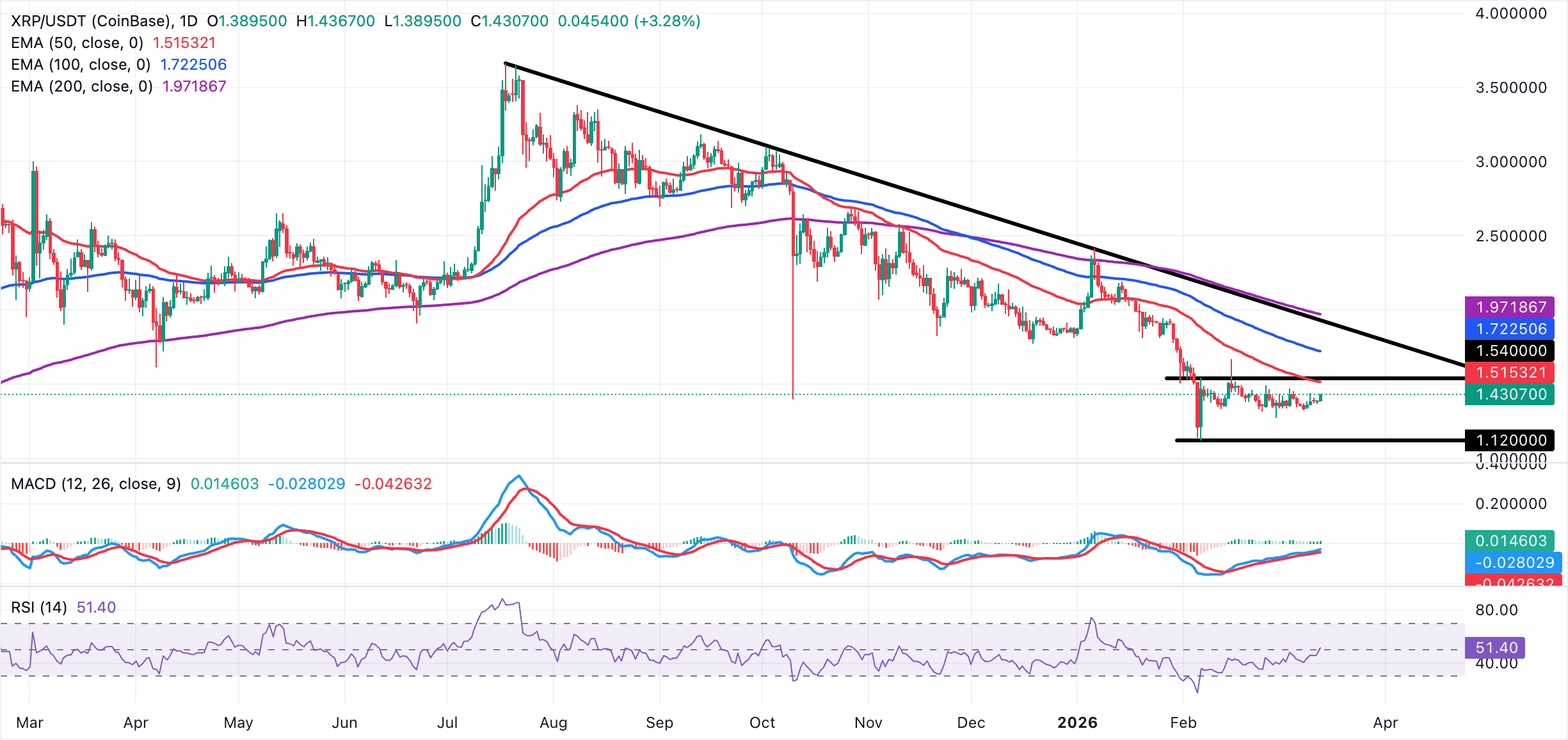 Despite the daily increase from the opening of $1.38, XRP remains below the declining 50-day, 100-day and 200-day EMAs, which continue to frame a broader downtrend and cap upside expectations toward the descending trendline.