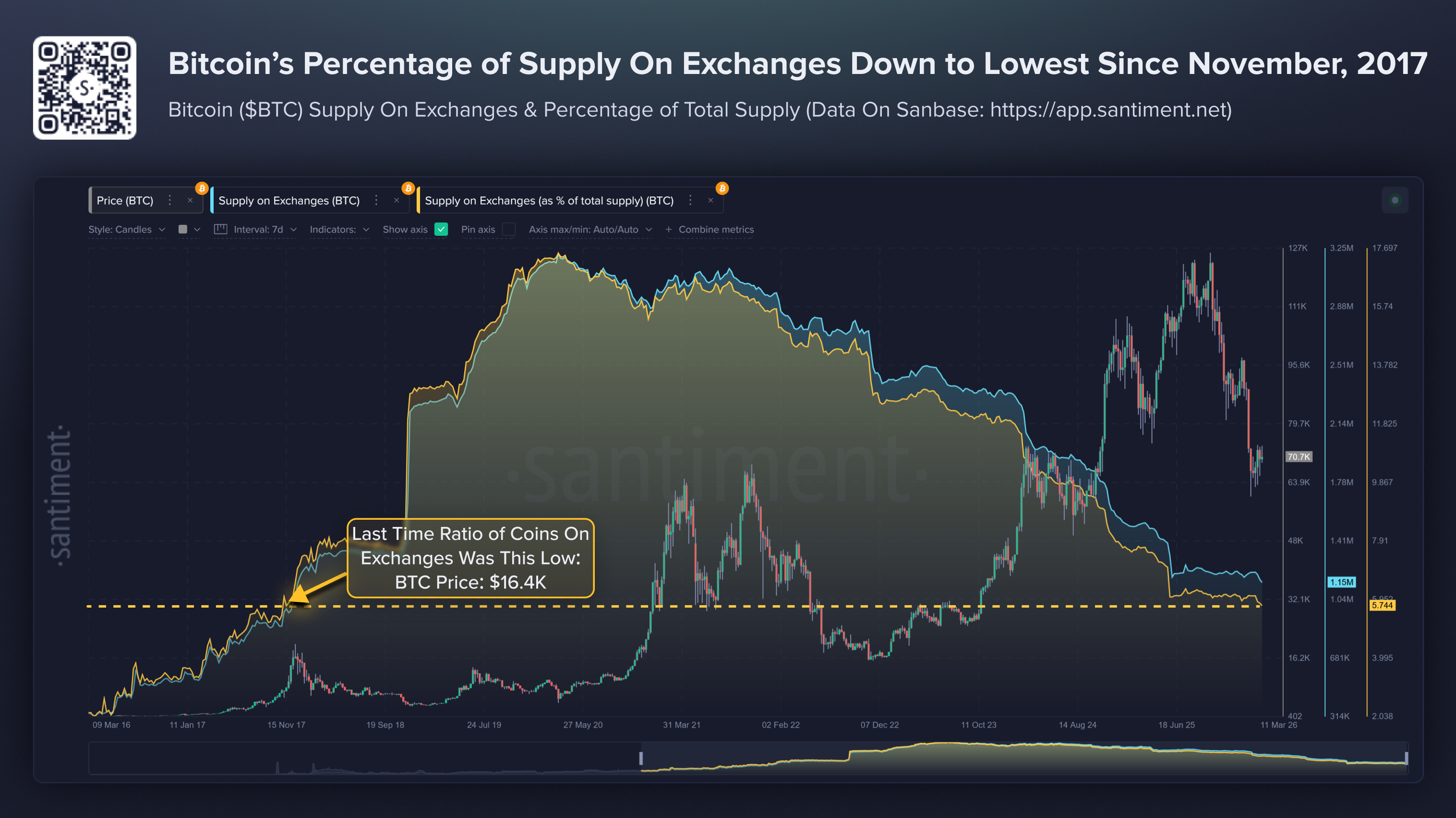 Bitcoin’s percentage of supply on the exchange chart. Source: Santiment