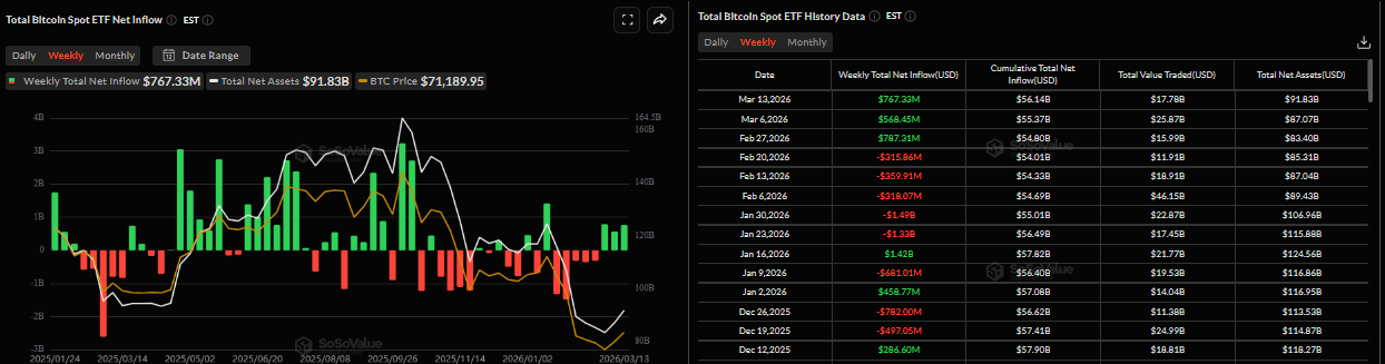 Institutional demand for Bitcoin remained strong last week, indicating growing investor confidence. According to SoSoValue data, spot Bitcoin ETFs recorded inflows of $767.33 million last week, following $568.45 million positive flows the previous one. This is the third consecutive week of inflows, and if these continue and intensify, BTC could see a rally in the upcoming weeks.