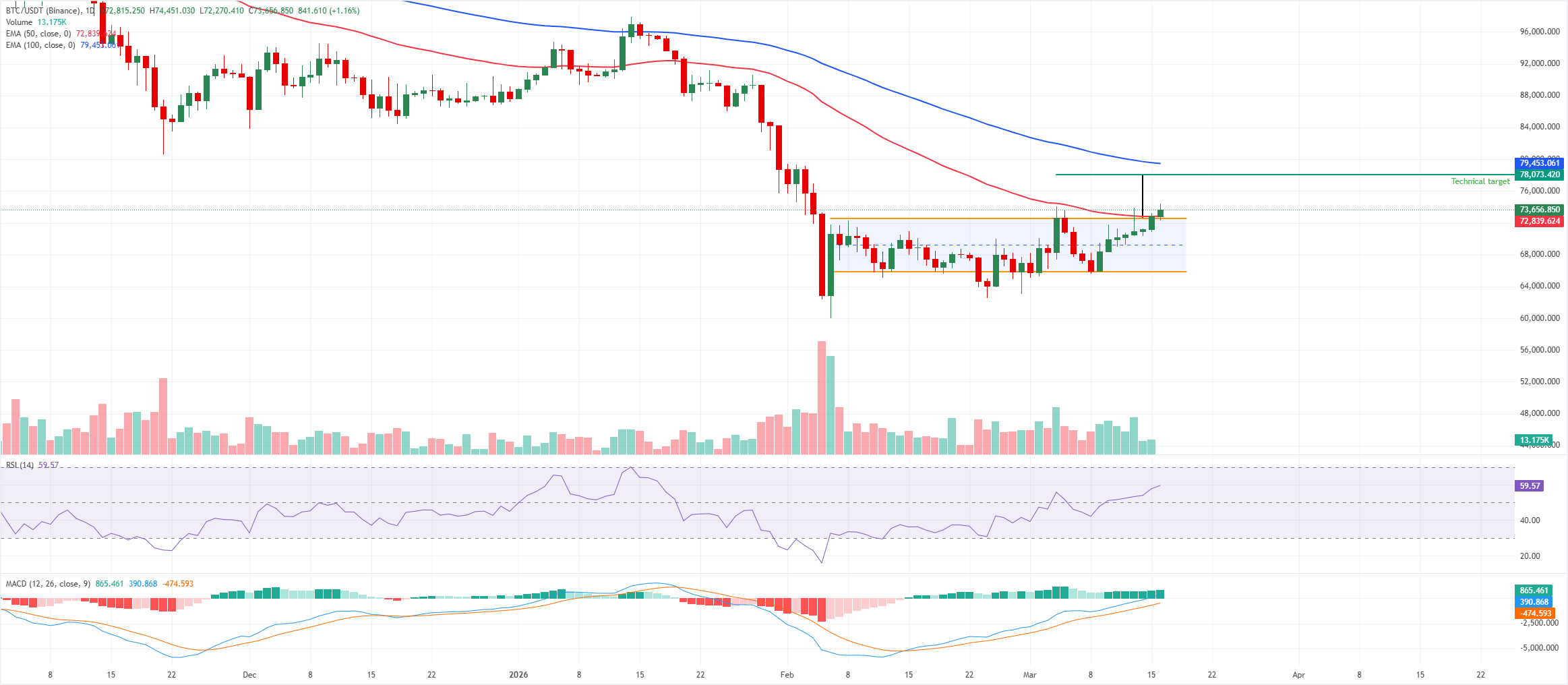 Bitcoin (BTC) extends gains, trading above $73,000 at the time of writing on Monday, following a bullish breakout from the consolidation pattern it had been trading since roughly the past six weeks. Institutional demand supports the positive outlook, as spot Exchange Traded Funds (ETFs) recorded their third consecutive week of inflows despite markets being cautious due to the US-Israel war on Iran. With the breakout confirmed, the technical outlook suggests the Crypto King could hit the breakout target above $78,000 in the upcoming days.
