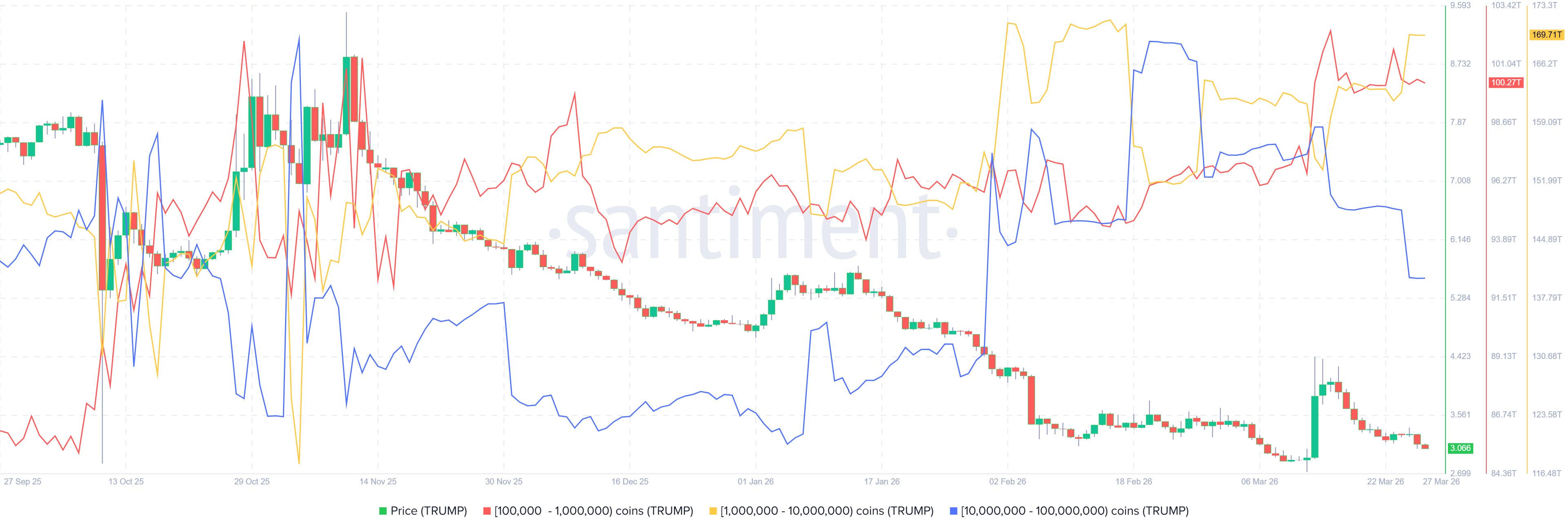 The metric shows that whales holding between 100,000 and 1 million tokens (red line in the chart below) and between 10 million and 100 million tokens (blue line) have shed a total of 16.31 trillion tokens since March 14. In the same period, whales holding between 1 million and 10 million tokens (yellow line) have accumulated 15.33 trillion TRUMP tokens. This indicates a shift in positioning among large wallets, with certain top-tier whales reducing exposure. In contrast, mid-sized whales absorb some of the supply, often reflecting distribution at higher levels and adding to near-term downside risks for Official Trump meme coin.