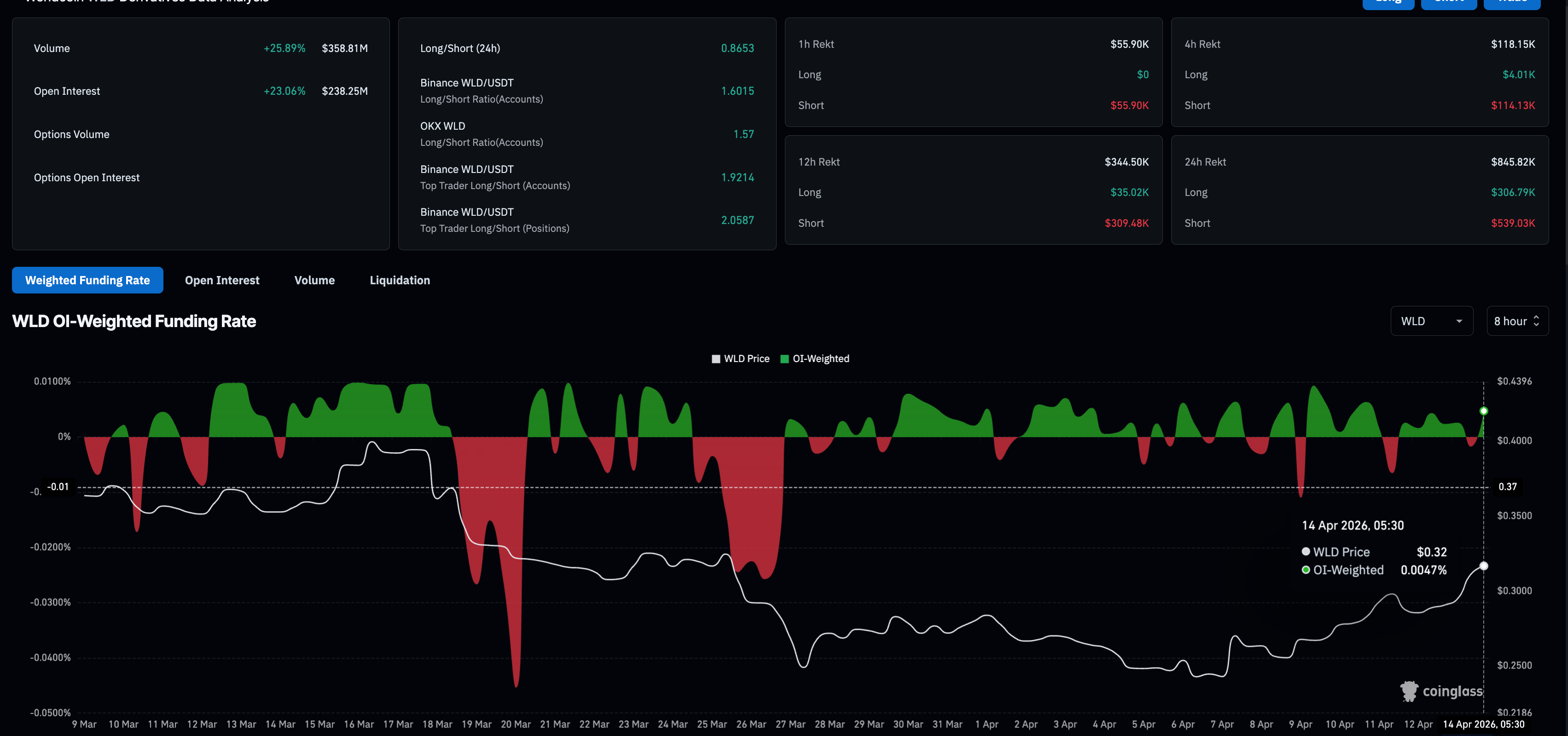 Worldcoin shows a steady recovery since the announcement of US-Iran peace talks on April 7, resulting in 15% gains last week. CoinGlass data shows a 23% rise in WLD futures Open Interest (OI) over the last 24 hours, suggesting a positional buildup amid growing anticipation among traders. Meanwhile, the OI-weighted funding rate turns positive to 0.0047%, from -0.0017% the previous day, suggesting near-term buy-side inclination.