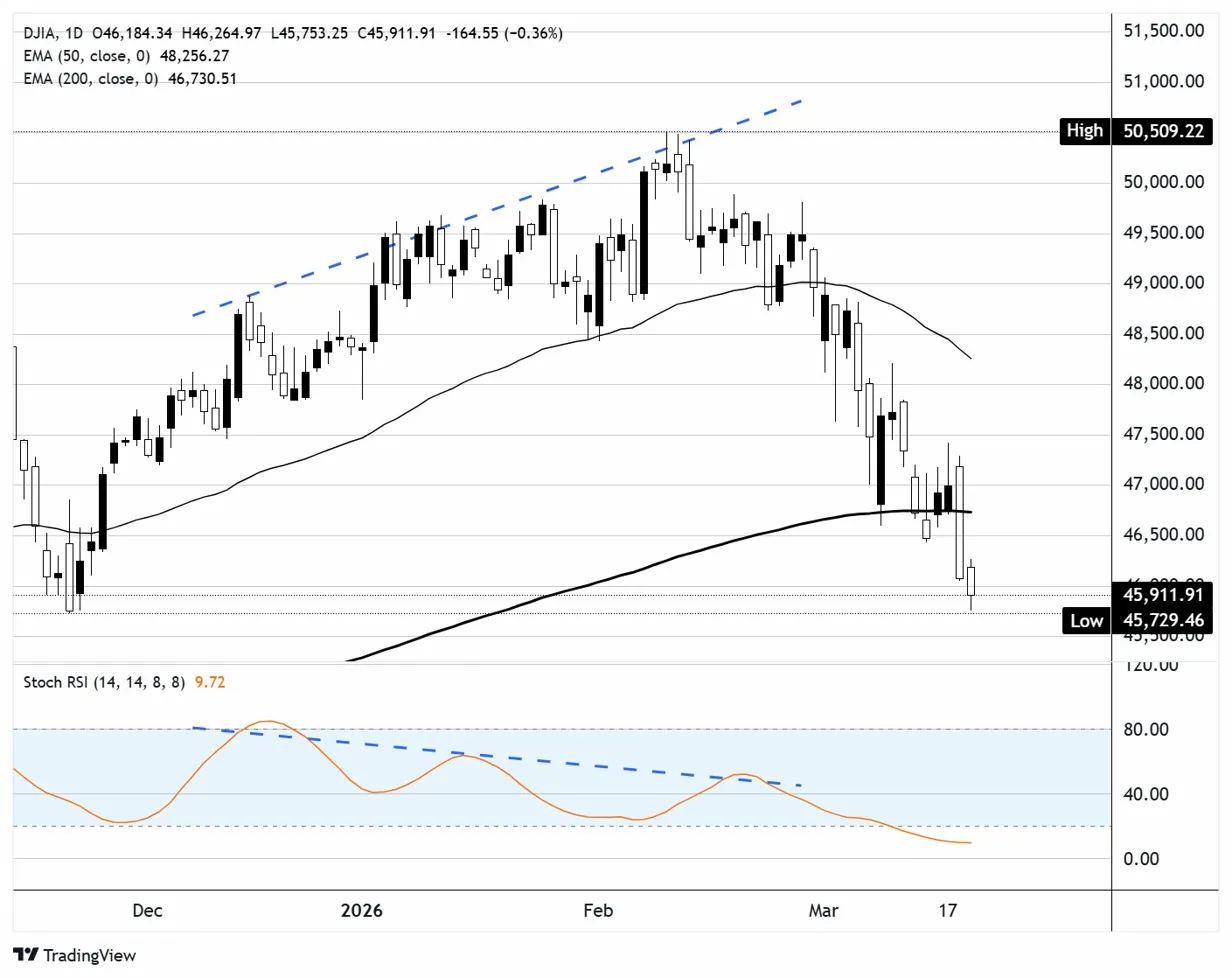 Boeing (BA) was the heaviest drag on the Dow, falling over 3% as the broader industrial sector came under pressure from rising input costs and supply chain uncertainty tied to the conflict. Caterpillar (CAT) dropped over 2%, and Sherwin-Williams (SHW) fell around 2%. On the upside, Salesforce (CRM) gained over 1.5% to lead Dow advancers, while Verizon (VZ) and Walt Disney (DIS) also posted modest gains. The DJIA is now trading well below its 200-day exponential moving average near 46,700 and roughly 9% off its all-time high above 50,500. The Stochastic RSI has fallen to deeply oversold levels near 10, the lowest reading in months — though oversold conditions alone are unlikely to trigger a reversal while oil prices remain untethered and rate cut expectations continue to erode.