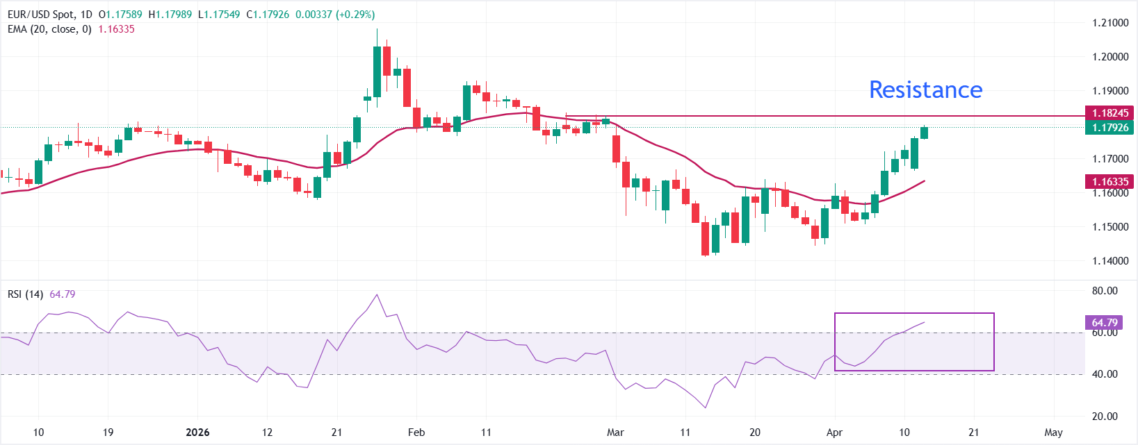 EUR/USD trades 0.3% higher to near 1.1800 during the European trading session on Tuesday. The pair holds a constructive near-term bias as spot remains above the 20-period Exponential Moving Average (EMA) at 1.1633, keeping the recent rebound intact.