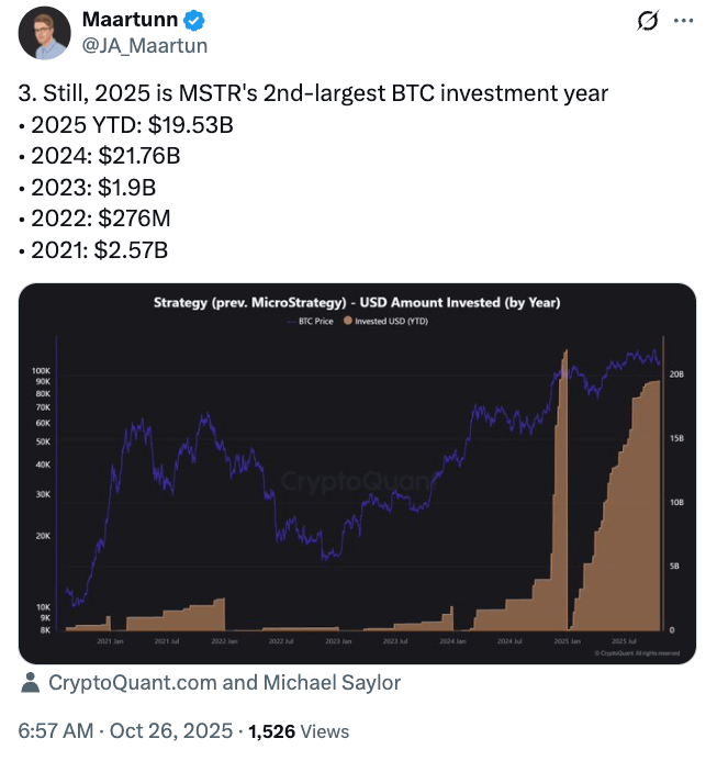 บทวิเคราะห์: ถึงจะซื้อน้อยลง แต่ Saylor ก็ยังซื้ออยู่ แสดงว่าศรัทธายังเต็มเปี่ยม แค่สปีดตกไปหน่อย แต่ปี 2025 นี้ก็ยังเป็นปีที่ Strategy ใช้เงินซื้อ BTC มากสุดที่ 19.53 พันล้านดอลลาร์