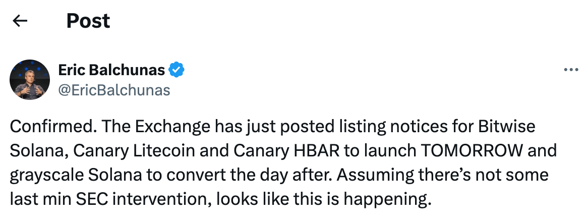 ตลาด ETF คริปโตอาจจะได้คึกคักอีกรอบ Eric Balchunas นักวิเคราะห์ ETF มือดีจาก Bloomberg ตาไวไปเห็นรายชื่อ ETF ของ Solana (SOL) จาก Bitwise, Litecoin (LTC) และ Hedera (HBAR) จาก Canary โผล่ในลิสต์ตลาดสหรัฐฯ คาดว่าจะเปิดเทรดกันวันนี้เลย