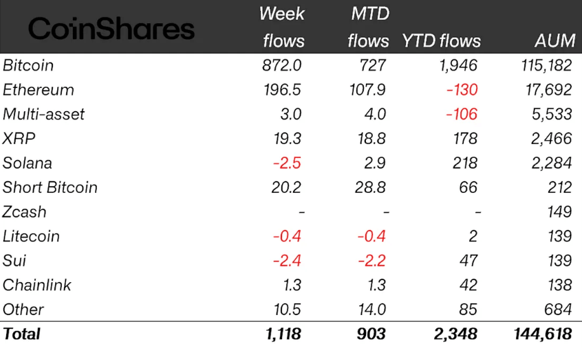 โดยพี่ใหญ่อย่าง Bitcoin กวาดไปเน้นๆ $871 ล้าน ตามมาด้วย Ethereum ที่กลับมามีเงินไหลเข้าอีกครั้งกว่า $196 ล้าน หลังจากที่เงียบเหงาไปสามสัปดาห์ติด