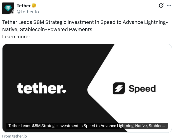 ยักษ์ใหญ่ผู้ออก Stablecoin อันดับหนึ่งอย่าง Tether เดินเกมรุกขยายอาณาจักรอย่างต่อเนื่อง ล่าสุดทุ่มเงินลงทุนกว่า 8 ล้านดอลลาร์ในสตาร์ทอัพชื่อ Speed เพื่อพัฒนาระบบชำระเงิน Stablecoin บน Bitcoin Layer-2 หรือ Lightning Network