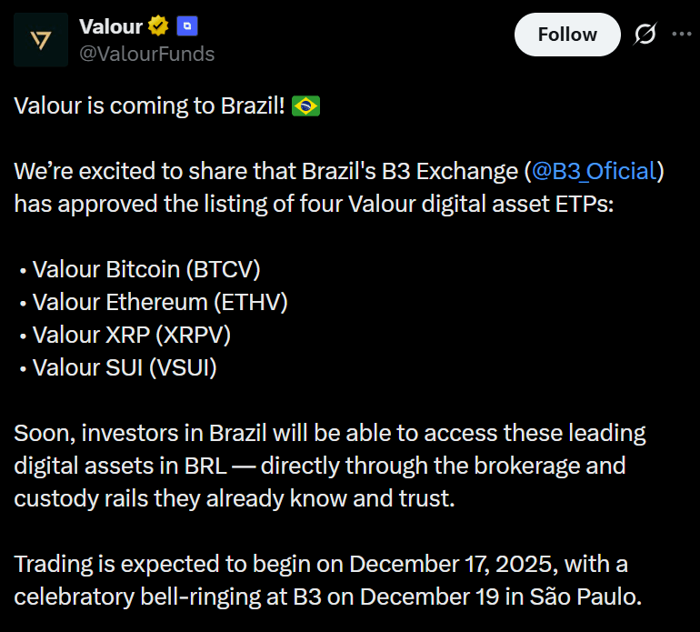 บราซิลกำลังก้าวขึ้นมาเป็นสมรภูมิสำคัญของโลกคริปโตฯ ล่าสุด Valour บริษัทลูกของ DeFi Technologies ได้รับไฟเขียวให้เปิดตัวกองทุน Solana ETP (VSOL) บนกระดานเทรดหลักของประเทศ (B3) ทำให้นักลงทุนสามารถเข้าถึง Solana ได้อย่างถูกกฎหมายและสะดวกสบาย