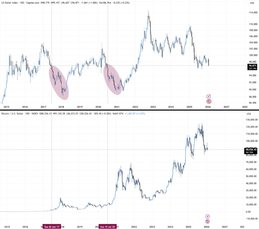 หลังจาก Bitcoin ร่วงแตะจุดต่ำสุดใหม่ของปี 2026 ที่ระดับ 86,000 ดอลลาร์ นักวิเคราะห์หลายคนเริ่มมองหาจุดกลับตัวที่สำคัญ โดยเฉพาะความสัมพันธ์กับดัชนีดอลลาร์สหรัฐ (DXY) ที่หากร่วงต่ำกว่าระดับ 96 เมื่อไหร่ ประวัติศาสตร์มักชี้ว่านั่นคือจุด Bottom ของ Bitcoin ทุกครั้ง
