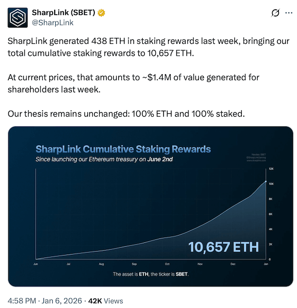 Tom Lee ประธานบริษัทระบุว่าหากนำ ETH ทั้งหมดที่มีไป Staking จะสามารถสร้างรายได้เฉลี่ยวันละกว่า 1 ล้านดอลลาร์เลยทีเดียว นอกจากนี้บริษัทยังเตรียมเปิดตัวระบบ Validator ของตัวเองในชื่อ MAVAN ภายในปี 2026 เพื่อบริหารจัดการการ Staking อย่างเต็มรูปแบบ ซึ่งเป็นโมเดลที่บริษัทจดทะเบียนรายอื่นอย่าง SharpLink Gaming เริ่มทำตามเพื่อสร้างผลตอบแทนที่สม่ำเสมอให้กับผู้ถือหุ้น
