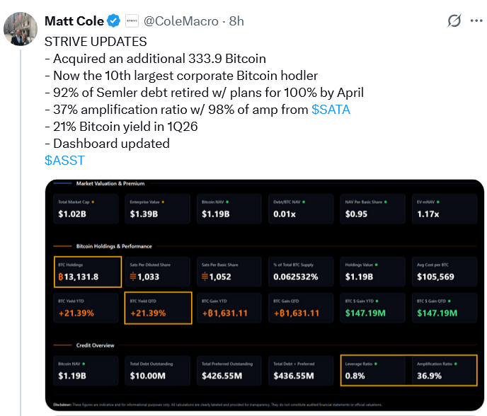 ล่าสุด Strive เพิ่งซื้อ Bitcoin เพิ่มอีก 334 BTC ที่ราคาเฉลี่ย $89,851 ส่งผลให้ปัจจุบันบริษัทถือครองรวม 13,132 BTC มูลค่าราว 1.17 พันล้านดอลลาร์ และสร้าง Bitcoin Yield ได้สูงถึง 21.2% ต่อไตรมาส แม้ราคาหุ้น ASST ในตลาดจะยังซบเซาแต่นี่คือการเดิมพันระยะยาวที่พิสูจน์ความเชื่อมั่นในสินทรัพย์ดิจิทัลอย่างชัดเจน