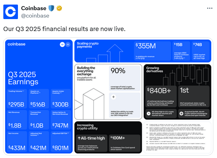 Coinbase เผยผลประกอบการไตรมาส 3 เติบโตอย่างก้าวกระโดด มีรายได้สุทธิเพิ่มขึ้น 5 เท่าเมื่อเทียบปีต่อปี แตะที่ 432.6 ล้านดอลลาร์ และรายได้รวมเพิ่มขึ้น 55% เป็น 1.9 พันล้านดอลลาร์