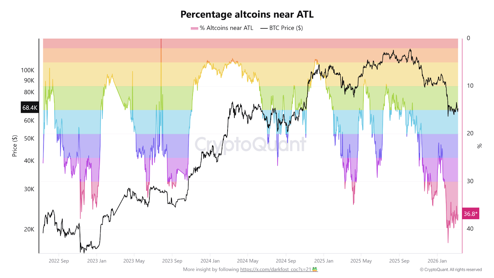 ข้อมูลจาก CryptoQuant ชี้ชัดว่า Altcoin กว่า 36.8% กำลังทำสถิติจุดต่ำสุดใหม่สะท้อนความอ่อนแออย่างหนักเมื่อเทียบกับพี่ใหญ่ ยิ่งไปกว่านั้นคู่เหรียญสำคัญอย่าง ETH/BTC ยังคงอยู่ในเทรนด์ขาลงอย่างต่อเนื่อง