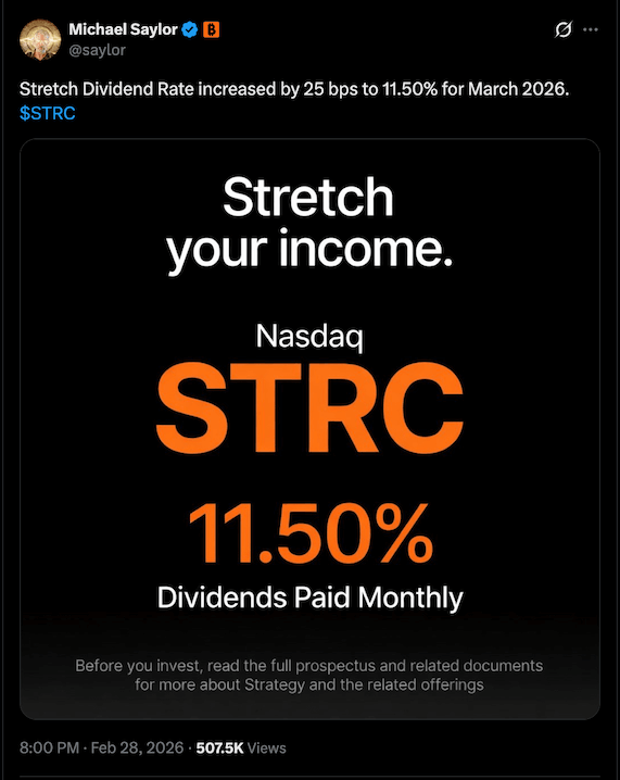 MicroStrategy ยังคงเดินหน้าเดิมพันด้วย Bitcoin แบบหมดหน้าตัก ล่าสุดได้ประกาศเพิ่มอัตราเงินปันผลรายเดือนสำหรับหุ้นบุริมสิทธิ STRC เป็น 11.5% สำหรับเดือนมีนาคม ปี 2026 เพื่อจูงใจนักลงทุน
