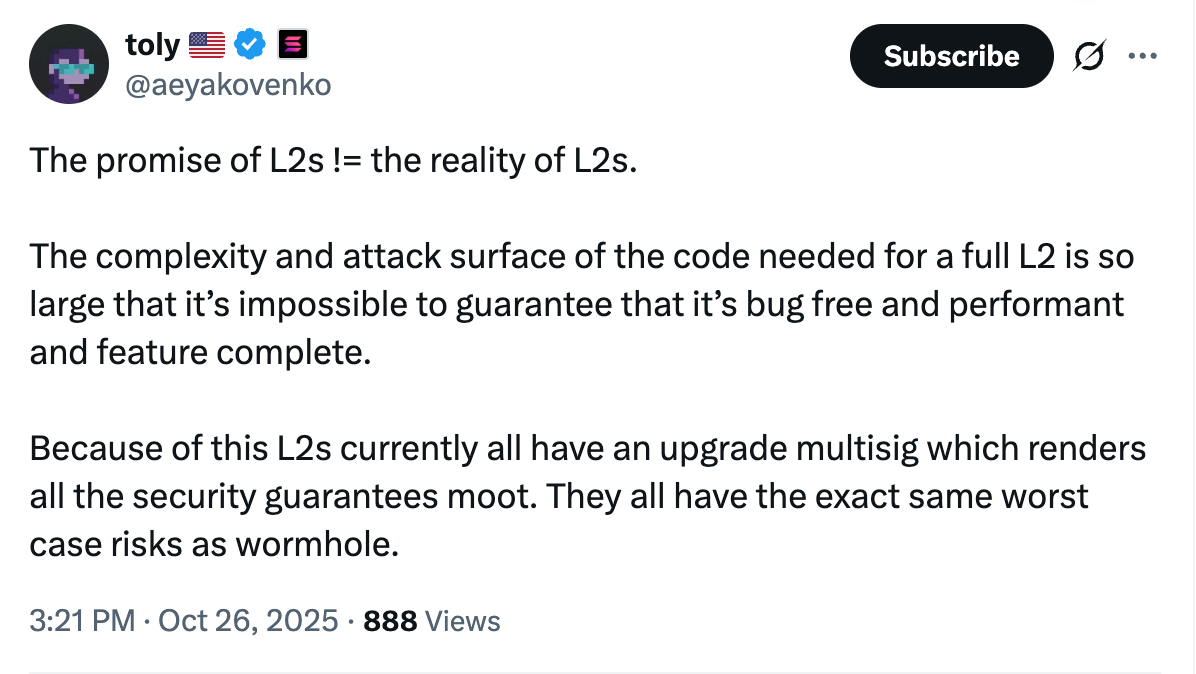 รอบนี้ Anatoly Yakovenko จาก Solana ออกมาตั้งคำถามกับความปลอดภัยและ Decentralization ของพวก Layer-2 (L2) บน Ethereum เขาแย้งว่า พวก L2 เนี่ย โค้ดมันใหญ่ซับซ้อนเกินกว่าจะตรวจสอบบั๊กได้หมด แถมยังมีช่องโหว่ให้โจมตีเพียบ