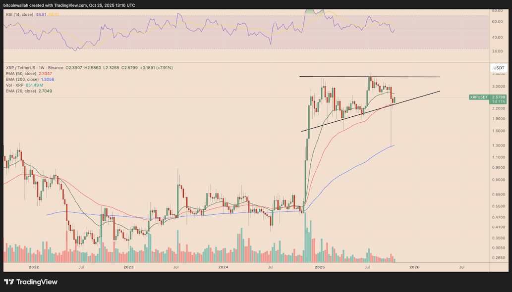 ข่าวดีชาว XRP กราฟกำลังส่งสัญญาณว่าอาจมีเบรคอเอาท์แรงๆ แถมงานนี้ CEO ใหญ่ Brad Garlinghouse ออกมาดันสุดตัว ในทางเทคนิค กราฟเด้งจากแนวรับสำคัญ (ขอบล่างของ Ascending Triangle) แถว $2.33 ซึ่งเป็นเส้น 50-week EMA พอดีเป๊ะ ในอดีต ถ้าเด้งตรงนี้ทีไร... มันพุ่ง 70-80% ตลอด