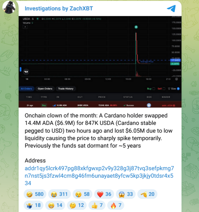 โดยนักสืบ on-chain อย่าง ZachXBT พบว่ามีการสวอป 14.4 ล้าน ADA (มูลค่า $6.9 ล้าน) แต่ได้กลับมาเป็น Stablecoin สกุล Anzens (USDA) เพียง $847,695 ทำให้ขาดทุนทันทีกว่า $6.05 ล้าน หรือราว 90% ของมูลค่า