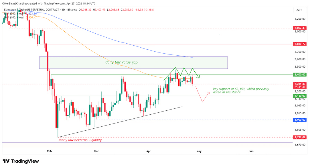 อาการน่าเป็นห่วง! Ethereum ชนแนวต้าน 2,400 ดอลลาร์ถึง 4 รอบ เสี่ยงร่วงหนักล้างพอร์ต 2.5 พันล้านดอลลาร์