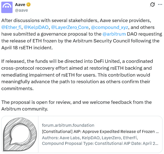 ล่าสุดกองทุนบรรเทาทุกข์ DeFi United ระดมทุนช่วยเหลือไปได้แล้วกว่า 21 ล้านดอลลาร์ และ Aave Labs ได้ยื่นข้อเสนอให้ Arbitrum ปลดล็อกเหรียญ Ethereum จำนวน 30,765 เหรียญ มูลค่าราว 73.5 ล้านดอลลาร์ที่อายัดจากกระเป๋าของแฮกเกอร์ เพื่อนำมาเยียวยาผู้เสียหายและฟื้นฟูเหรียญ rsETH